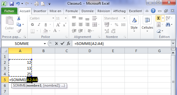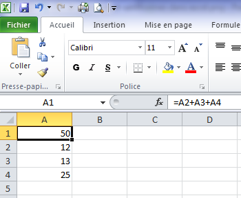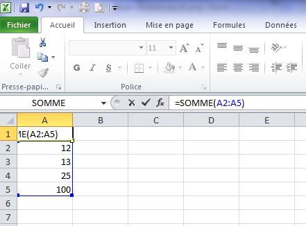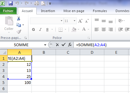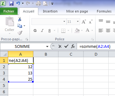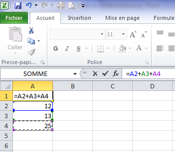 Placez-vous dans la barre de formule, juste après "fx" et tapez =somme(A2:A4). Vous verrez alors les cellules A2, A3 et A4 encadrées en bleu. Appuyez sur Entrée et le tour est joué.