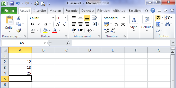 Première étape : ouvrir Excel, une feuille de calcul vierge s'ouvrira par défaut. Entrer les nombres que vous souhaitez additionner. Ici nous ferons le test avec trois nombres : 12, 13 et 25. Le total faisant bien entendu 50.