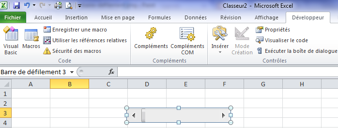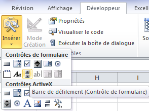 Pour ajouter une barre de défilement, cliquez dans l'onglet Développeur sur Insérer puis sur Barre de défilement.