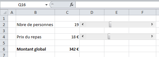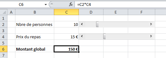 Et voici le résultat. J'ai ajouté une seconde barre de défilement pour le prix du repas, et mon résultat s'affiche automatiquement en C6 en fonction des deux curseurs au-dessus. Classe non ?