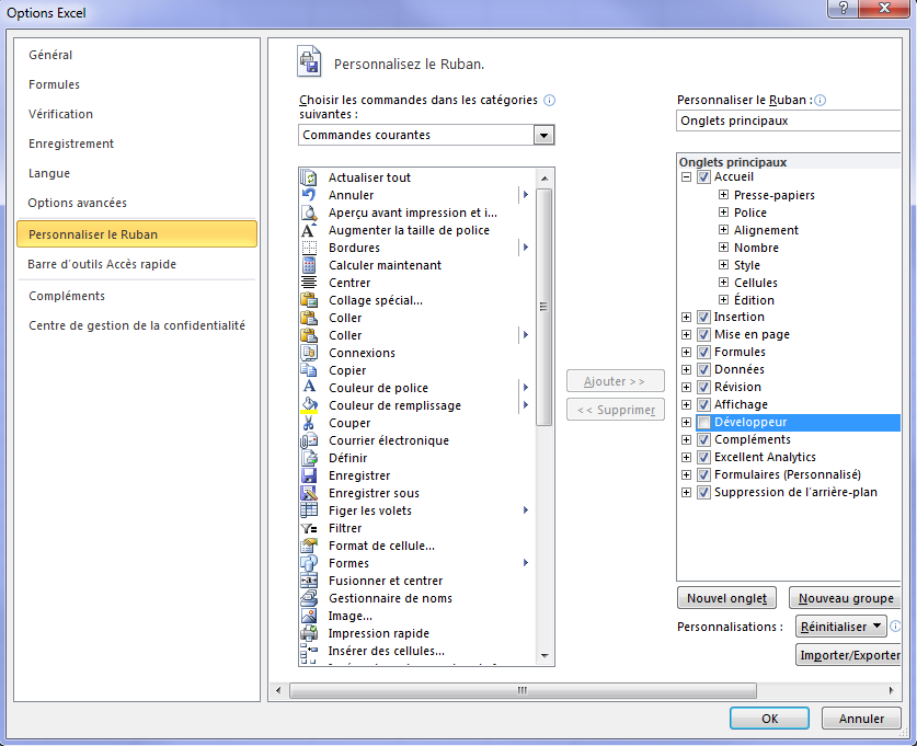 Puis dans le menu "Personnaliser le ruban", cochez dans le bloc de droite "Développeur" puis validez en tapant OK.