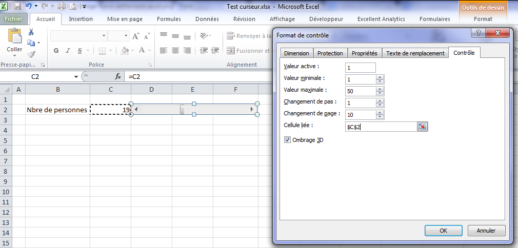 Dans l'exemple ci-dessous je prends le cas d'un nombre de personnes pour un repas. Le nombre de personnes possible est de 50. Le pas est bien entendu de 1 (on ne compte pas une demi personne) et lorsque l'on clic sur la barre, j'ai décidé que l'on augmenterait la valeur de 10 en 10. Enfin, j'ai besoin d'afficher la valeur en C2 (important, si vous n'êtes pas certain de savoir à quoi correspondent les sigles $, je vous invite à parcourir l'article suivant Excel - Comment figer une cellule ?).