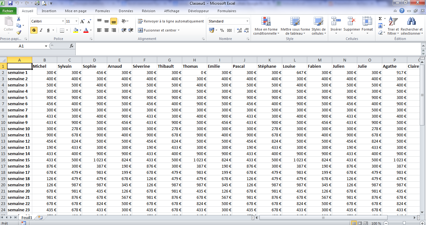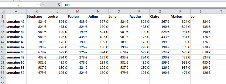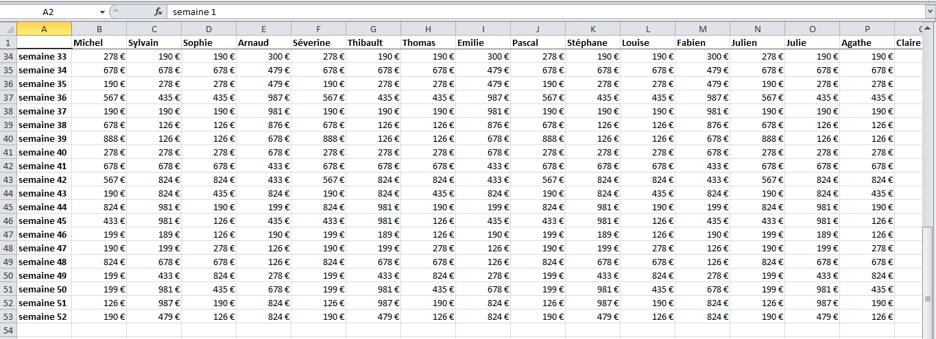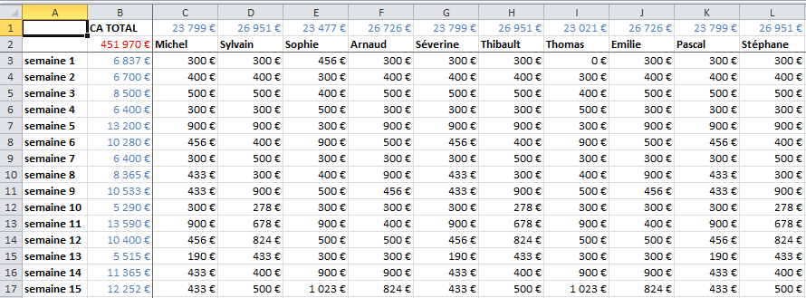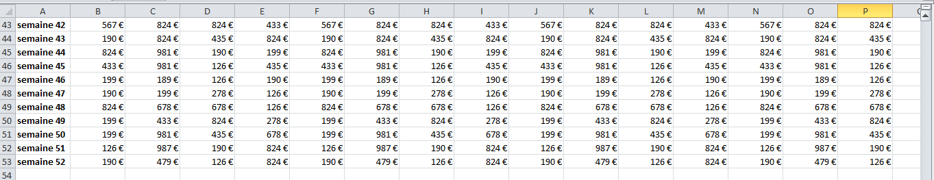 Prenons un exemple. Voici un tableau très simple, mais qui comporte énormément de valeurs. Ici le chiffre d'affaires de 18 commerciaux réparti sur les 52 semaines de l'année.